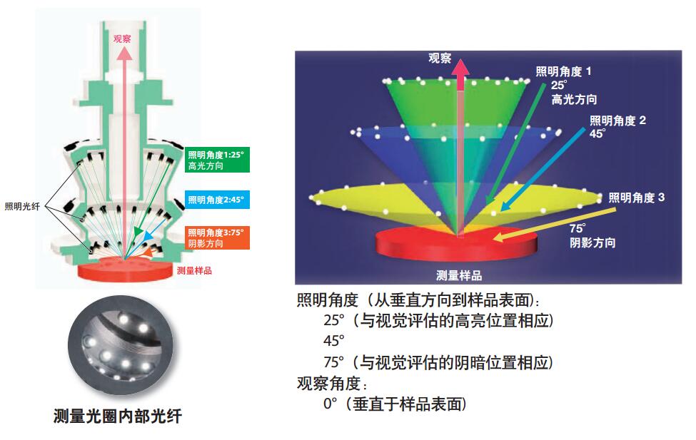 環(huán)形照明系統(tǒng)把隨機影響降到*低 三個角度的照明都是通過環(huán)形排列的18根光纖提供的。這個照明系統(tǒng)以樣品表面的法線為中心形成25°,45°和75°的錐 形,從而把儀器測量時由于方向旋轉(zhuǎn)偏差造成的影響降低,而單向照明很大程度上會受到方向旋轉(zhuǎn)偏差的影響。