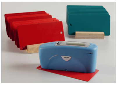 特殊應(yīng)用的光澤測量 特殊的材料要求特殊的測量角度: 陶瓷材料,塑料薄膜和硬質(zhì)塑料,紙張和硬紙板不僅可用20", 60°, 85*常規(guī)角度進(jìn)行測量,也可按照行業(yè)標(biāo)準(zhǔn)選擇45°或 75°。 微型光澤儀45° 對于中低光澤產(chǎn)品,塑料薄膜和硬質(zhì)塑料,不論透明還是不 透明材質(zhì),通常都用45角來測量。對于透光的薄膜,請用型 號為5015的黑色耐擦洗實(shí)驗(yàn)板作為啞光黑色背景(174頁) 墊 于樣品背后。如果沒有合適的背景板,測量會(huì)發(fā)生錯(cuò)誤。 標(biāo)準(zhǔn)的測量方法要求每個(gè)樣品至少測量三個(gè)點(diǎn),以獲取光澤 均質(zhì)性指征。微型光澤儀統(tǒng)計(jì)測量模式,可顯示平均值和差 值范圍或者顯示測量樣品的均質(zhì)性的標(biāo)準(zhǔn)偏差值。 |