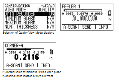 5位顯示,在標(biāo)準(zhǔn)模式下具有0.75英寸數(shù)字高度,在厚度+A掃描模式下具有0.25英寸數(shù)字高度,實(shí)心或空心數(shù)字耦合狀態(tài)指示器,射頻模式下A掃描視圖。 |