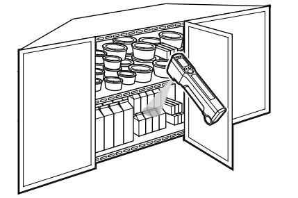 理想的情況是,產(chǎn)品的溫度應(yīng)盡可能在冷藏環(huán)境以外進(jìn)行測(cè)量。如 果必須在冷藏環(huán)境,如大型冷庫(kù)中進(jìn)行測(cè)量,應(yīng)進(jìn)行快速測(cè)量(低 于 1 分鐘),或應(yīng)等待 30 分鐘,使儀器在冷藏環(huán)境(高于 0 °C / 32 °F)中達(dá)到穩(wěn)定后再進(jìn)行測(cè)量。在儲(chǔ)存箱中測(cè)量物體時(shí),應(yīng)打開(kāi)門窗,并直接掃描產(chǎn)品的統(tǒng)一溫度。如果出現(xiàn)溫度較高的區(qū)域,則 表示是存放不當(dāng)造成柜中空氣不流通所致。