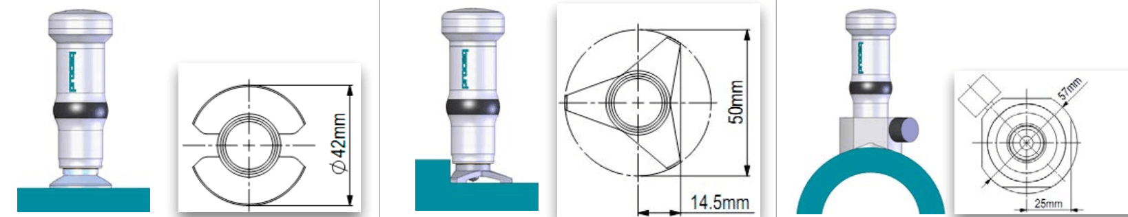 圓形標(biāo)準(zhǔn)腳(磁性) 適用于扁平部件和邊緣距離大于 10 mm 的檢測位置。 三腳架的腳 專為要求精確定位的檢測件(焊接、受 熱區(qū)域)而設(shè)計(jì)。 特殊腳 RZ 18-70 和 70-∞ 專為彎曲的測試件(例如圓柱形部件、管子、導(dǎo)管)而 設(shè)計(jì)。 |